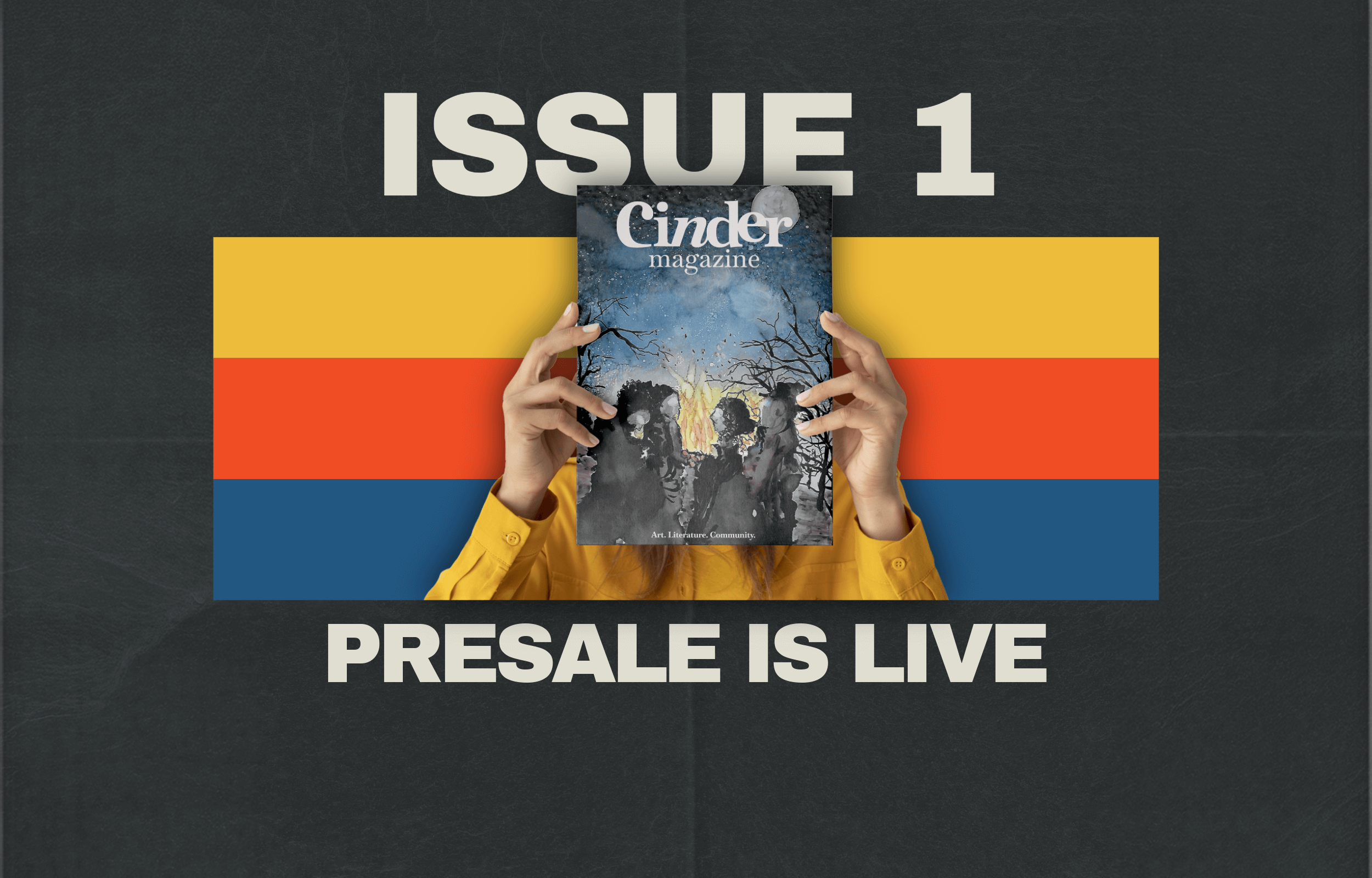 Alt Image Caption: Mockup image shows a model holding the first issue of Cinder Magazine. Background text reads: Issue 1 presale is live.